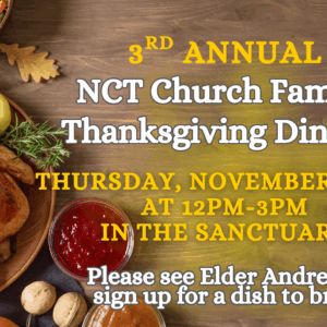 You are invited to our 3rd Annual NCT Church Family Thanksgiving Dinner, we will meet in the sanctuary on Thursday, November 27th from 12pm to 3pm. Let’s come together in fellowship as we break bread and give thanks to the Lord for His goodness. What dish/item will you bring to share, a Turkey? Mac“n”Cheese? A case of water? Please see ...