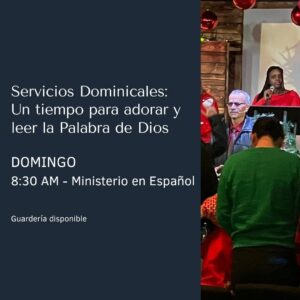 Servicios Dominicale: Un tiempo para adorar y leer la Palabra de Dios DOMINGO 8:30 AM – Ministerio en Español Guardería disponible