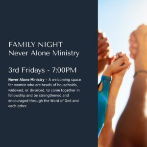 Never Alone Ministry – A welcoming space for women who are heads of households, widowed, or divorced, to come together in fellowship and be strengthened and encouraged through the Word of God and each other.