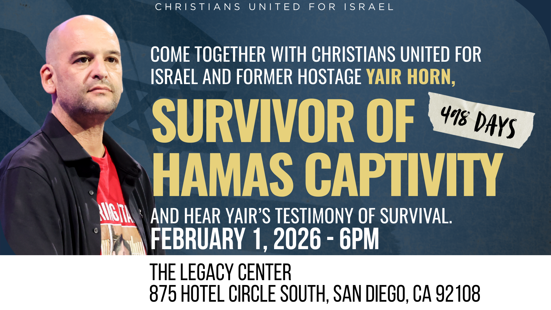 Come together with Christians United for Israel and former hostage, Yair Horn, survivor of 498 days in Hamas captivity and hear Yair’s powerful testimony how he held on to his faith to survive.